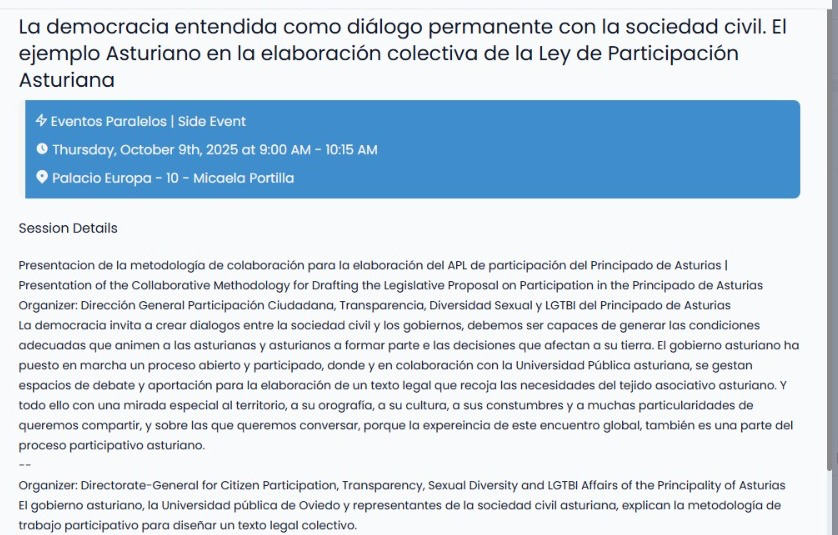 El 9 de octubre de 2025, Daniel Jove Villares y Patricia García Majado participaron en la OGP Global Summit Open Government, celebrada en Vitoria, donde expusieron el papel que la Universidad de Oviedo estaba desarrollando en la elaboración del anteproyecto de ley de participación asturiana, junto con miembros implicados de la sociedad civil y la Consejería de urbanismo, ordenación del territorio, vivienda y derechos ciudadanos del Principado de Asturias.