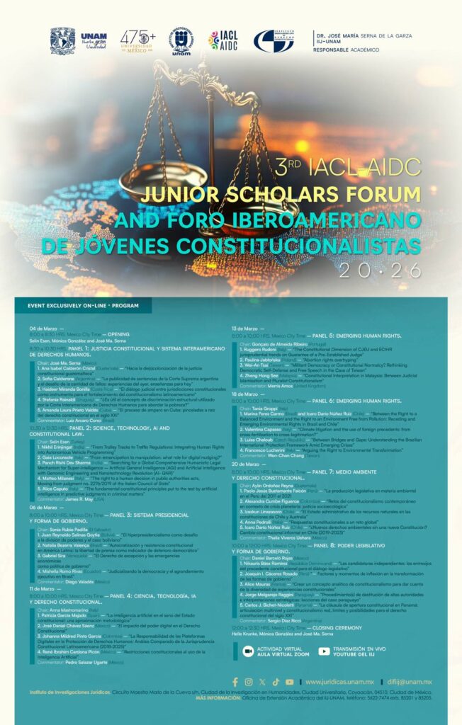 Patricia García Majado intervino en el 3º Junior Scholars Forum and Foro Iberoamericano de Jóvenes Constitucionalistas, organizado por la International Association of Constitutional Law ( IACL-AIDC), el Instituto de Investigaciones Jurídicas de la UNAM y el Instituto Iberoamericano de Derecho Constitucional, el 11 de marzo de 2026, con una presentación sobre «La inteligencia artificial en el seno del Estado Constitucional: una aproximación metodológica».